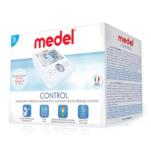 medelCONTROL Descrizione Misuratore di pressione braccio che consente la misurazione e il monitoraggio dei valori di pressione arteriosa. Permette di misurare in modo rapido e semplice la propria pressione, memorizzare i valori misurati e visualizzare l'andamento e la media dei valori. Segnala inoltre eventuali disturbi del ritmo cardiaco. Una indicazione sul display permette di verificare il corretto posizionamento del bracciale per una misurazione accurata. Caratteristiche tecniche Metodo di misurazione: oscillometrico, misurazione non invasiva della pressione dal braccio. Range di misurazione: pressione manicotto 0-300 mmHg...