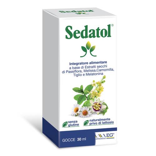 Sedatol gocceDescrizione Integratore alimentare a base di Melatonina ed estratti secchi di Passiflora, Melissa, Camomilla e Tiglio utile per favorire il rilassamento ed il sonno. Assunto poco prima di coricarsi, contribuisce a ridurre il tempo necessario per addormentarsi ed allevia gli effetti del jet lag. Ingredienti Acqua, glicerolo, fruttosio, melissa (Melissa officinalis L., foglie) estratto secco, camomilla (Matricaria chamomilla L., fiori) estratto secco, tiglio (Tilia cordata Mill. e Tilia platyphyllos Scop., fiori) estratto secco, passiflora (Passiflora incarnata L., erba con fiori) estratto secco, aromi, conservante: sorbato d...